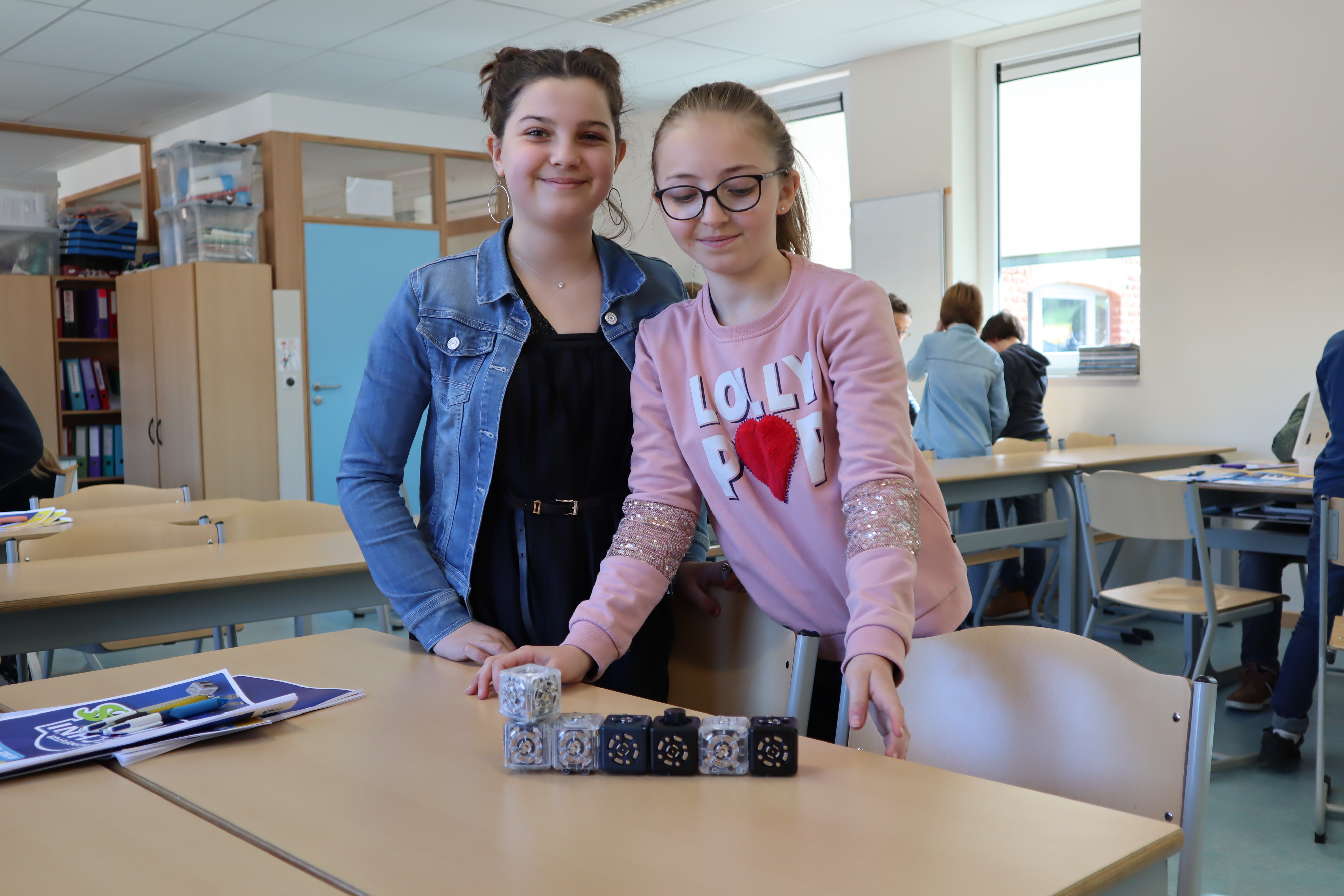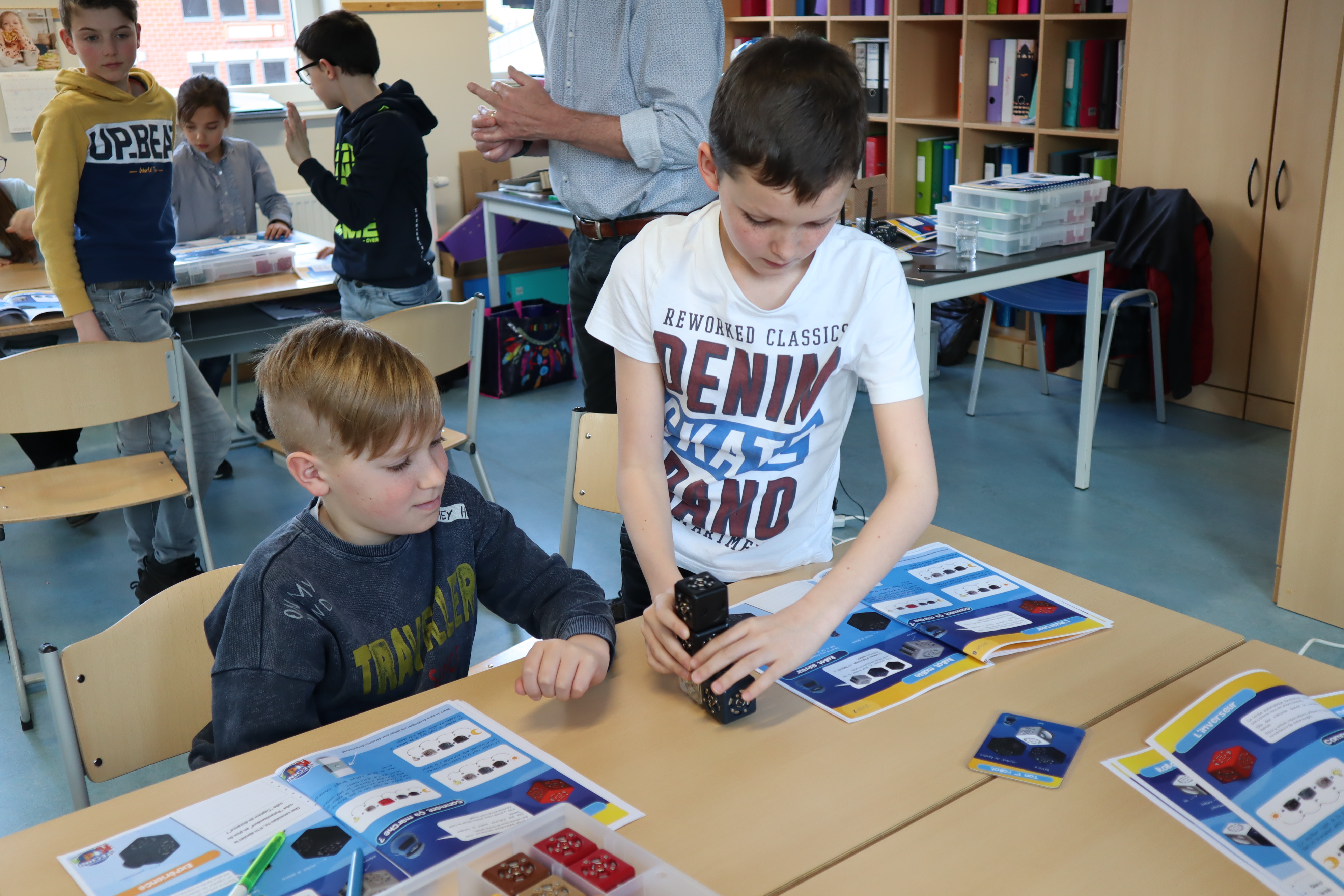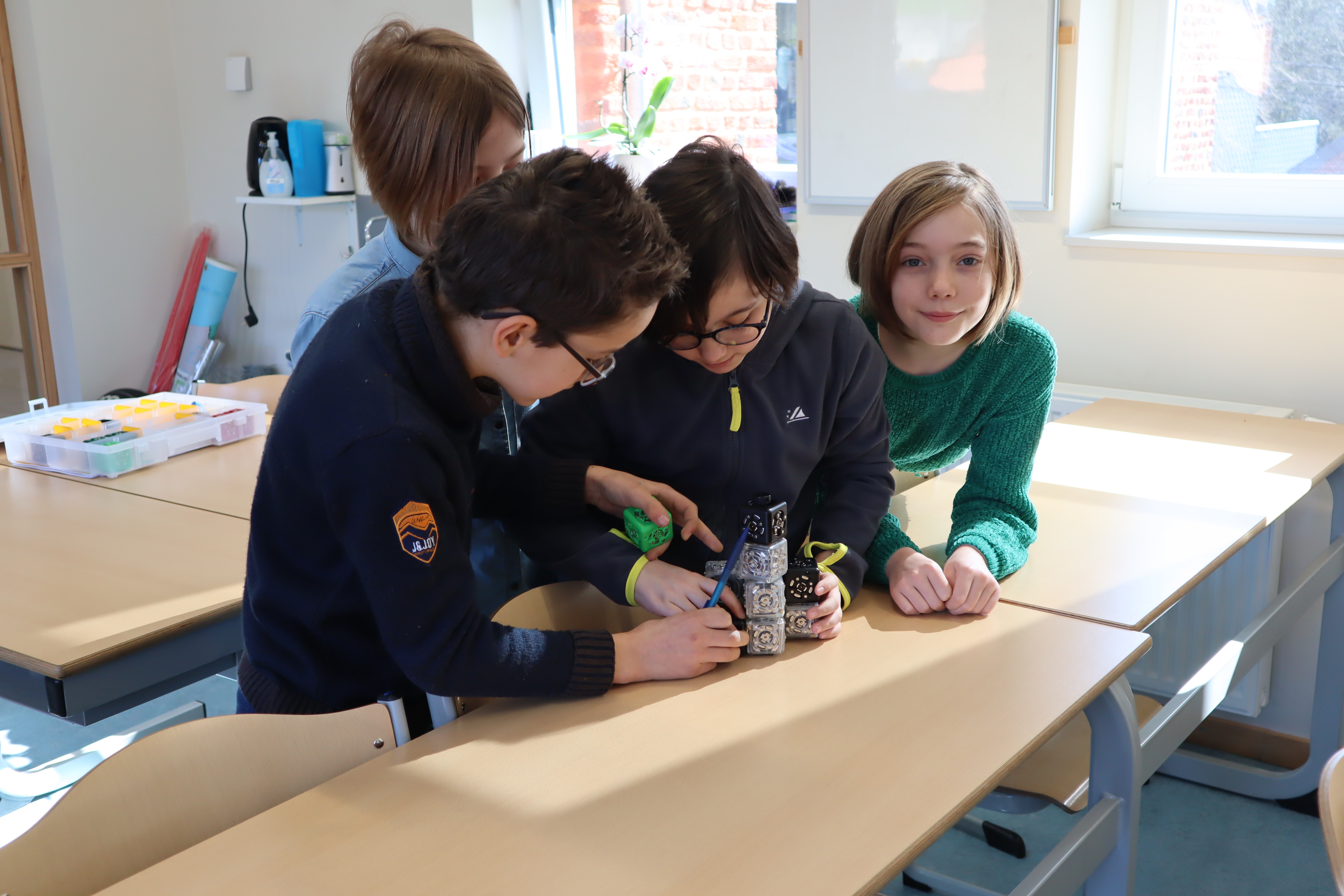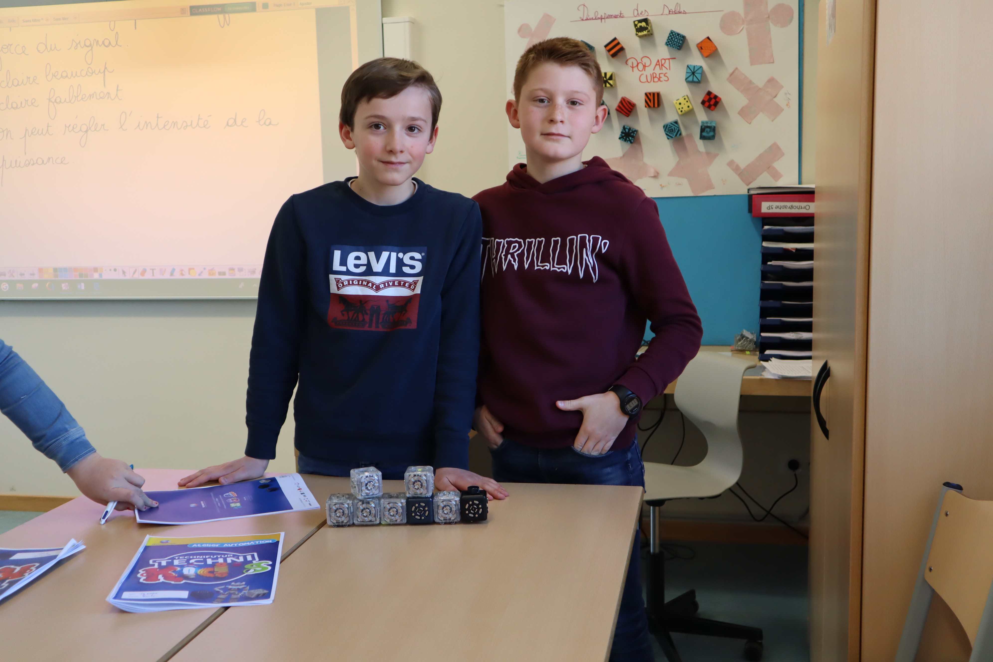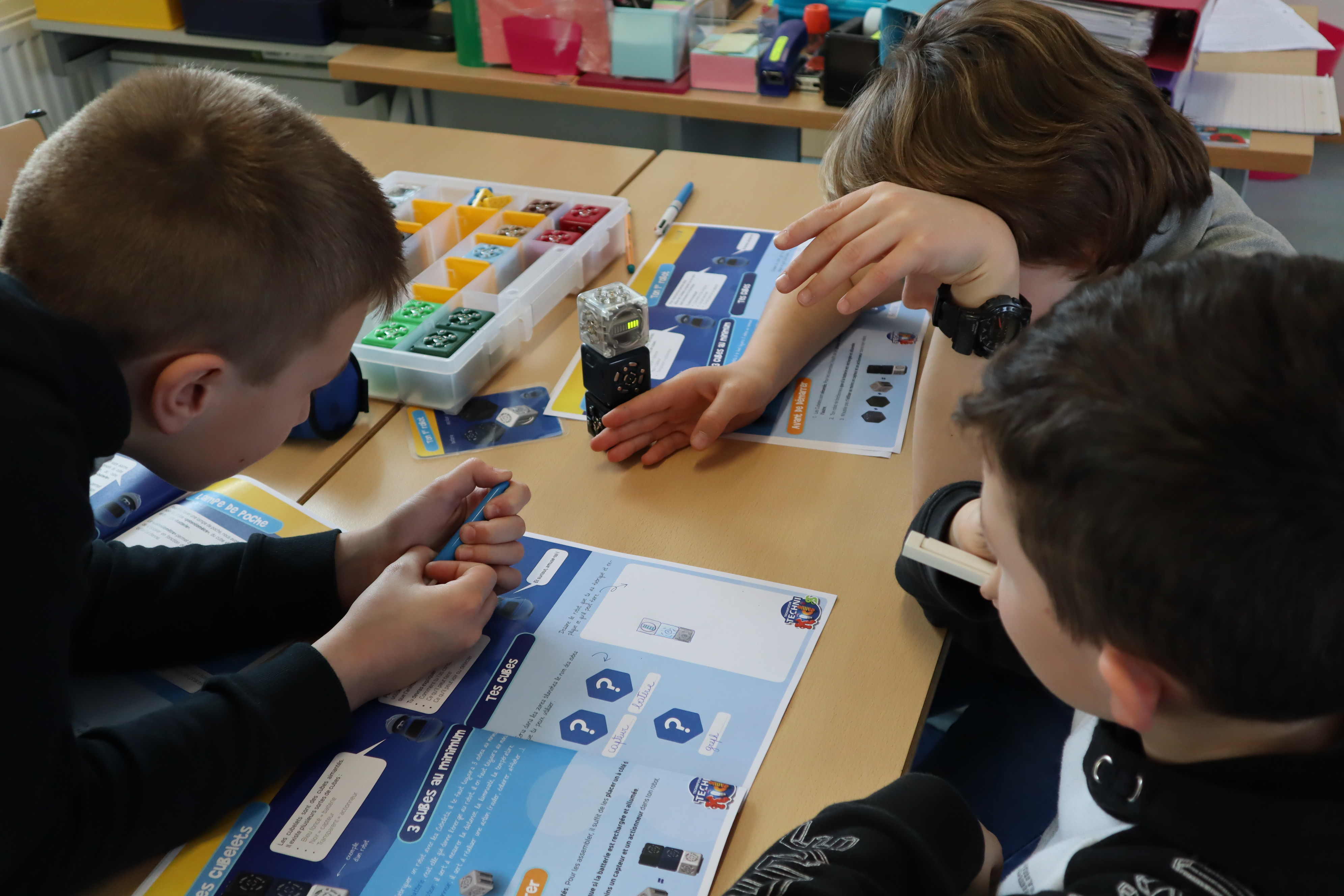 Ils ont pu manipuler, par groupe, des cubelets. Ce sont des cubes aimantés. Il en existe plusieurs sortes : une batterie, un capteur et un actionneur. Ils ont créé leur « premier robot » en assemblant 3 cubelets.