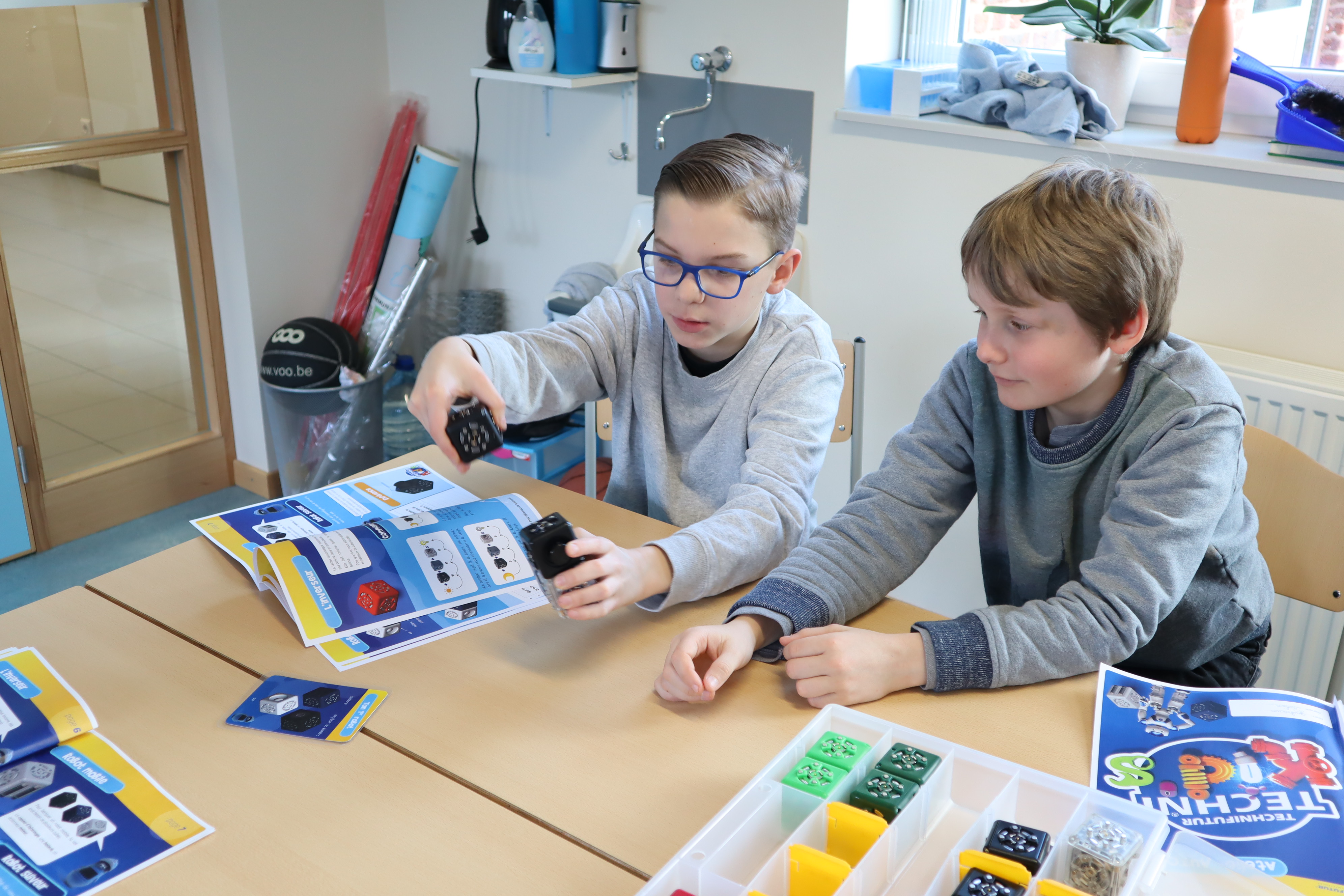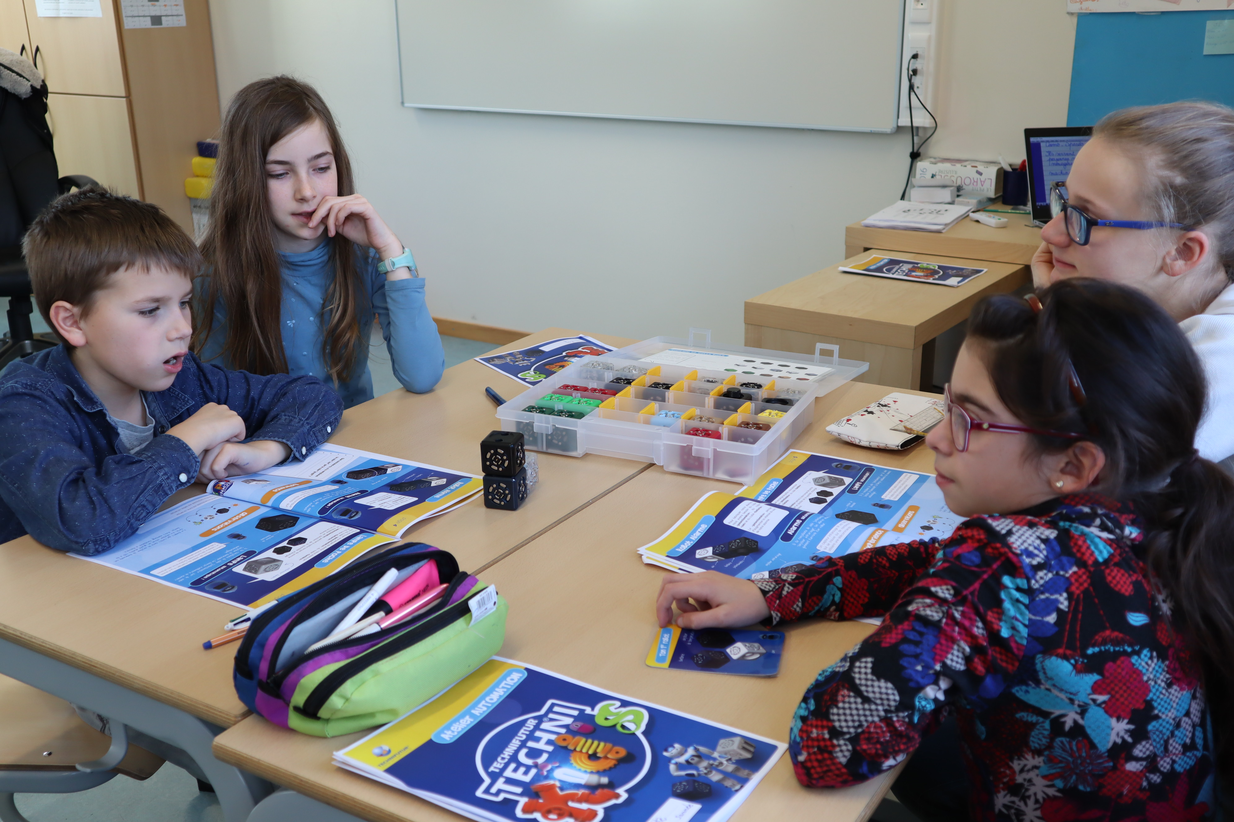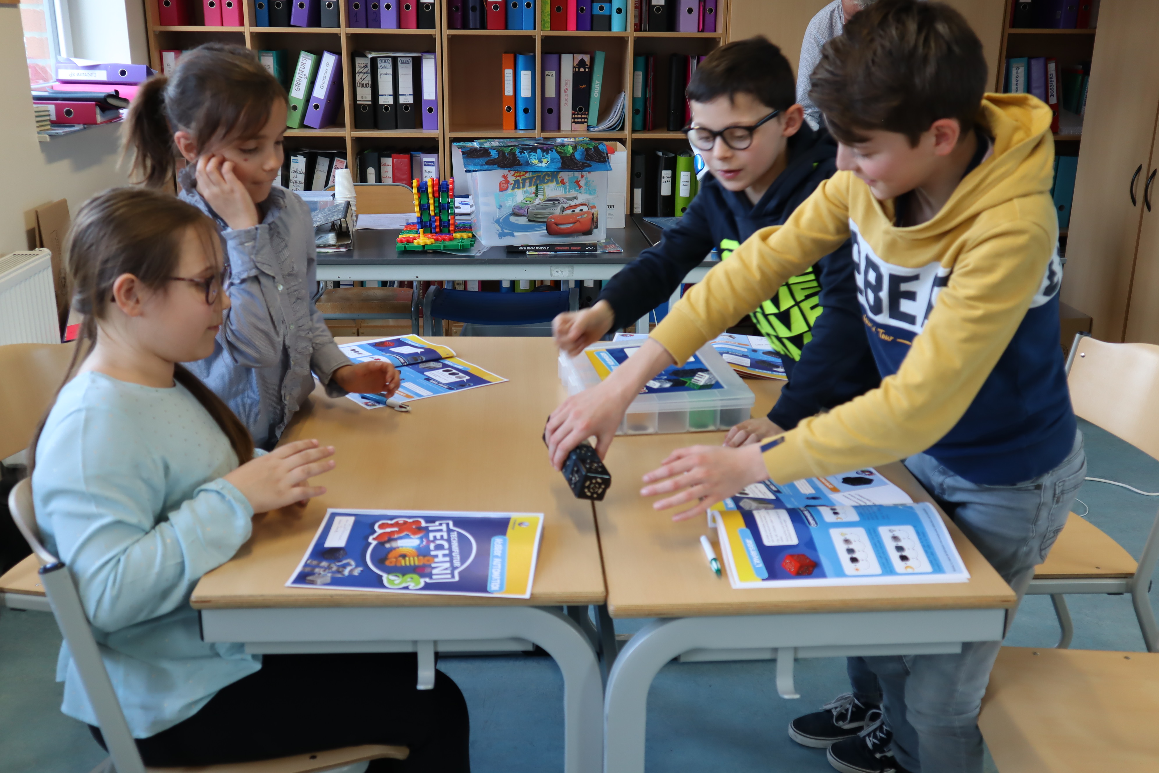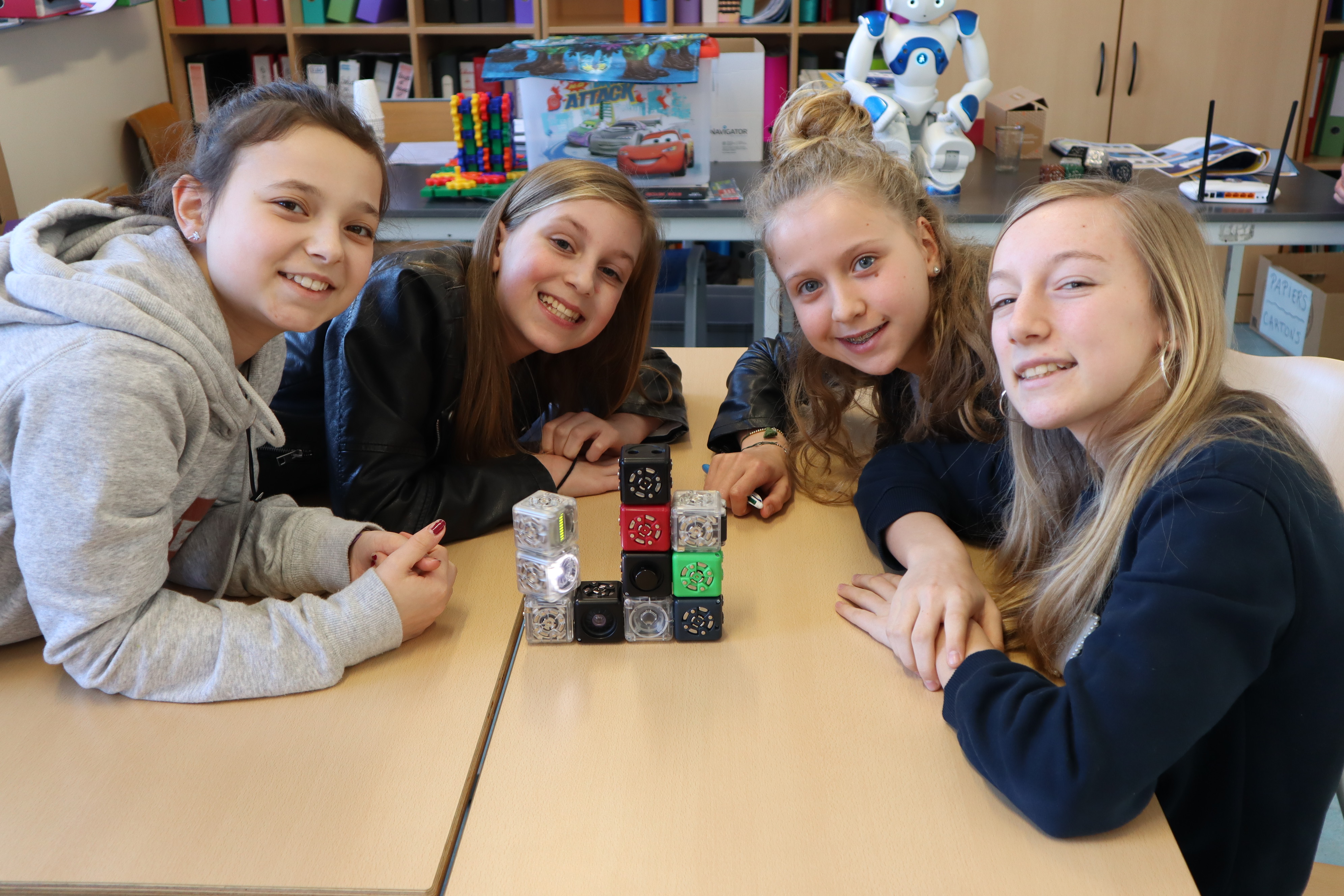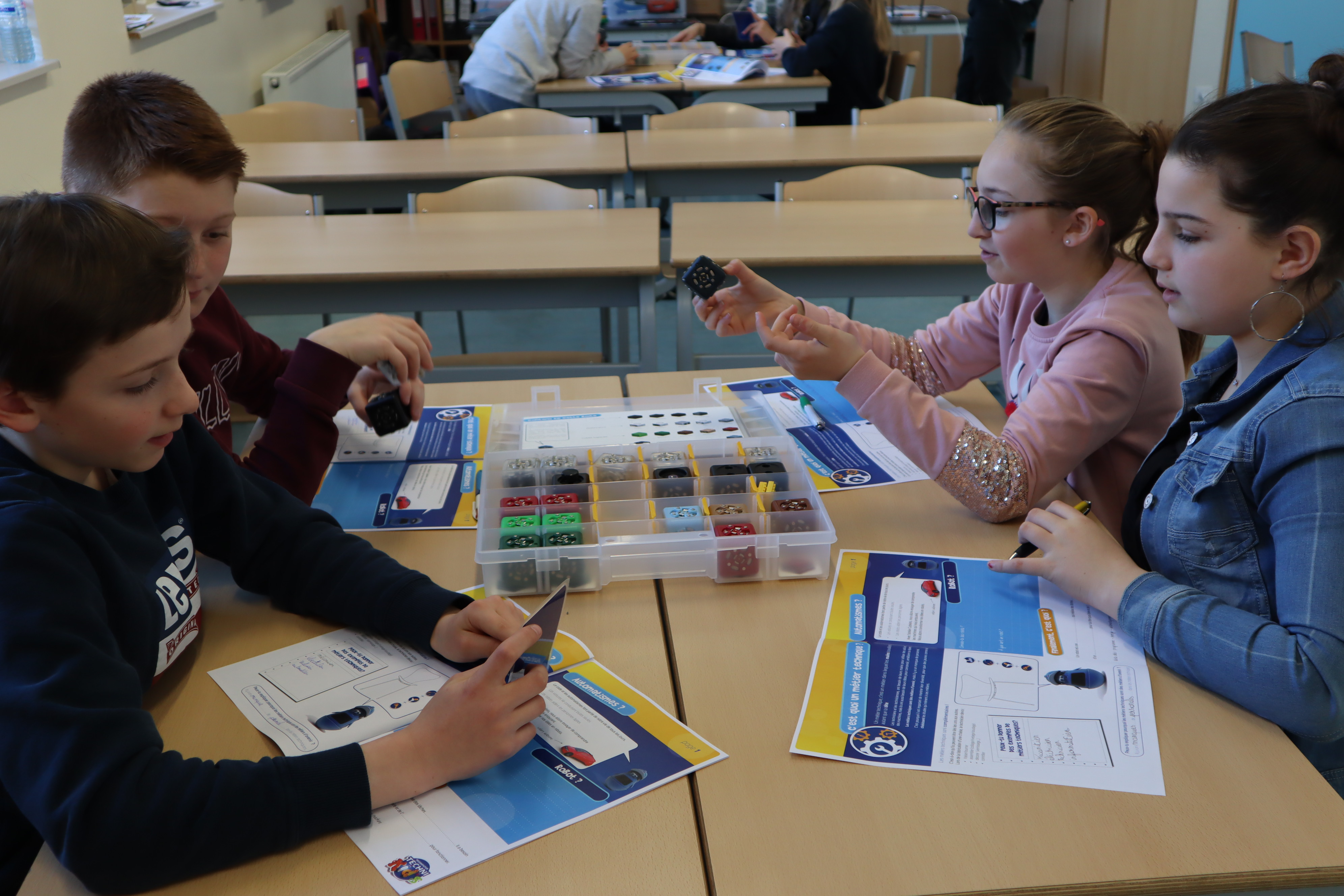 Ils ont pu manipuler, par groupe, des cubelets. Ce sont des cubes aimantés. Il en existe plusieurs sortes : une batterie, un capteur et un actionneur. Ils ont créé leur « premier robot » en assemblant 3 cubelets.