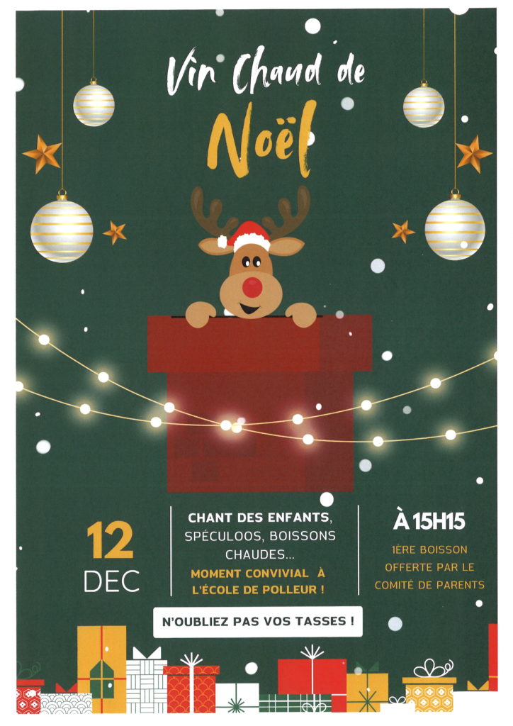 Ce sera un plaisir de vous accueillir ce 12 décembre ! Dès 15h15, le Comité des Parents vous offrira le premier verre. Surtout, n’oubliez pas vos tasses. Les enfants vous préparent des chants de Noël et la classe de 6ème année cuisinera une délicieuse soupe à l’oignon. Bloquez bien la date !